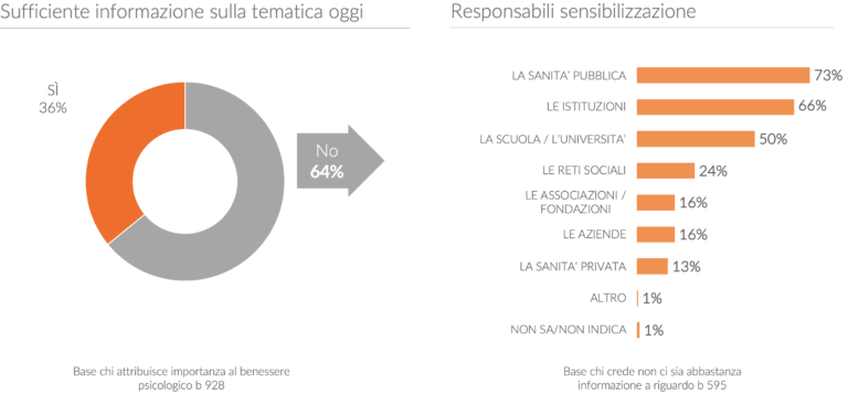 Q21N – Ha mai sentito la necessità di intraprendere un percorso psicoterapeutico con un professionista? Lo ha mai intrapreso? E proprio quello dell’informazione è evidenziato come tema delicato tra coloro che attribuiscono importanza al benessere psicologico. Infatti, il 64% ritiene che non ci sia sufficiente informazione sul tema, con la responsabilità di sensibilizzare il pubblico attribuita principalmente a istituzioni pubbliche, sistema scolastico e reti sociali, seguite da aziende (16%), associazioni e fondazioni (16%). Appare dunque evidente che anche i brand possano giocare un ruolo chiave all’interno del discorso, con la comunicazione che ha a tutti gli effetti il potenziale di colmare questo gap, offrendo strumenti per informare, sensibilizzare e promuovere un approccio positivo al tema.